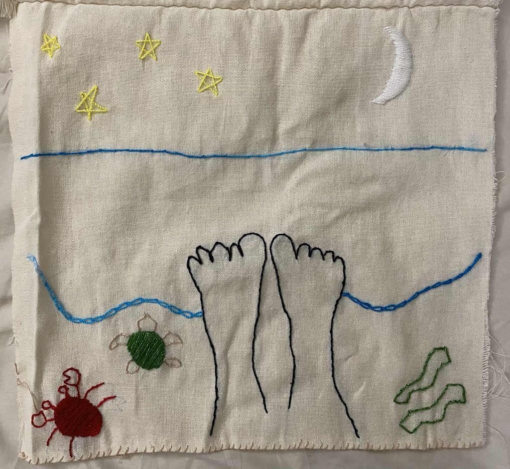 La autora comparte en esta ilustración la primera vez que mojó sus pies en el mar siendo de noche, esto como un reto, ya que temía a las texturas desconocidas que podría sentir en los pies al estar todo oscuro y la ansiedad generada por el fuerte sonido de las olas. Decidió ilustrar un cangrejo, algas y una tortuga como elementos que le había causado nerviosismo encontrar.