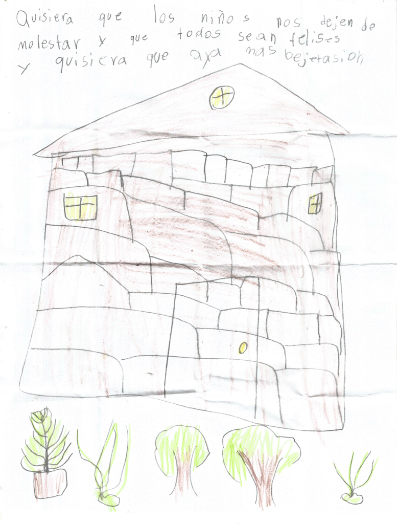 Regina en su texto, comprarte como deseo el que los niños no se comporten de manera grosera con las demás niñas, más personas felices y vegetación en su planta, como muestra en su dibujo con tres plantas y dos árboles, debajo de una casa construida con ladrillos.