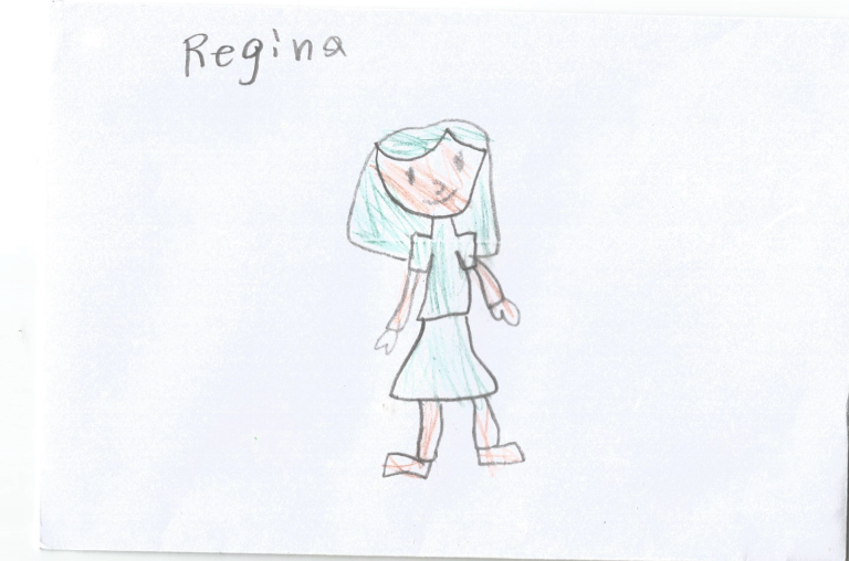Regina se dibujó con una playera de cuello largo, falda, cabello y ropa azul. En la parte de arriba colocó su nombre.