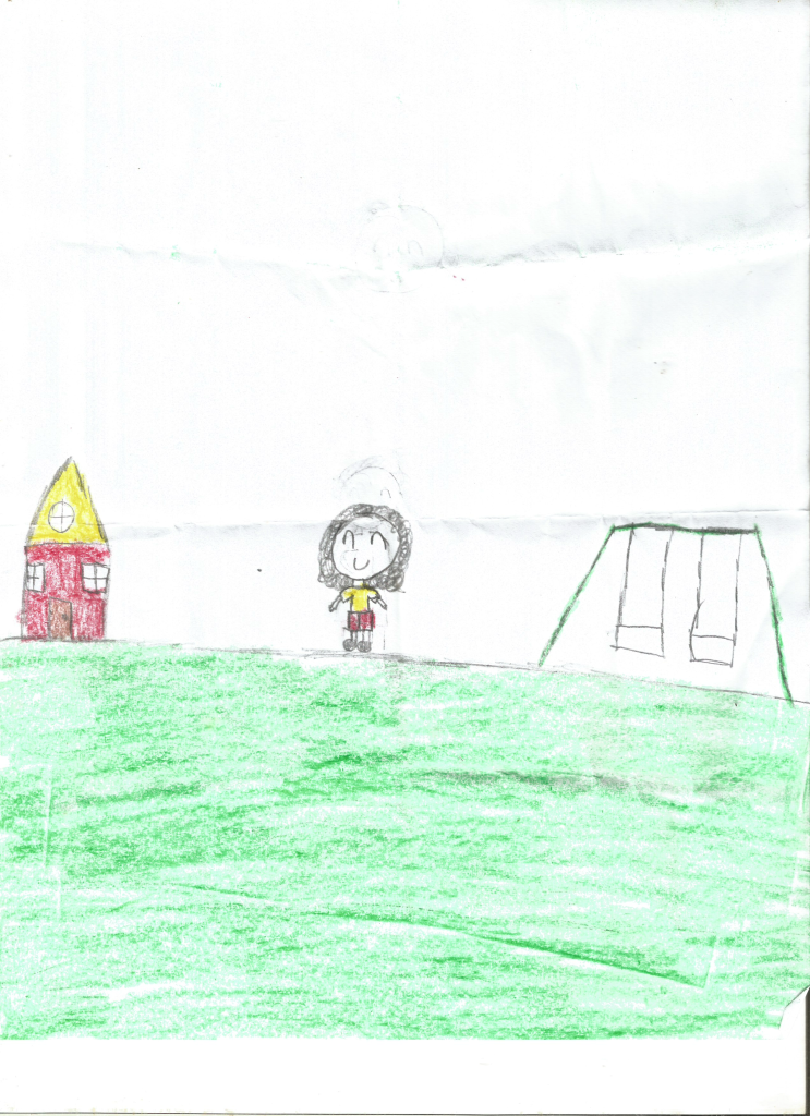 La niña se retrató feliz y mirando al sol, vistiendo una playera y una falda. Debajo de ella hay abundante pasto. En la esquina superior izquierda se encuentra su nombre en mayúsculas, escrito con el apoyo de la tallerista Isabel Flores: “AMAYRY”.