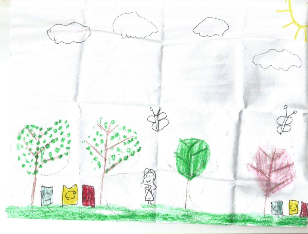 Un paisaje lleno de detalles. Juana colocó cuatro nubes en el cielo y un sol en la parte superior derecha. Debajo del cielo cuatro árboles distintos. Iniciando del lado izquierdo, el primer árbol tiene abundantes hojas, a un costado tres botes de basura con diferentes colores: azul, amarillo y rojo. Después continua otro árbol con menos hojas que el anterior. Juana se coloca en el centro y arriba de ella una mariposa, ambas no tienen algún color añadido. Prosigue con otro árbol completamente frondoso, ya que esta lleno de color verde en la parte de las hojas. El cuarto árbol tiene también ramas delgadas como los anteriores pero la parte de sus hojas es color rojo. Al costado derecho de este último árbol en la parte de arriba coloca otra mariposa sin colorear y debajo, Juana nuevamente coloca tres botes de basura con el mismo orden de colores. Todo lo anterior esta sobre pasto muy verde.