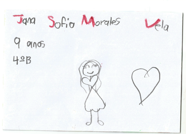 de cada palabra al ser estos nombres propios: “Jana Sofia Morales Vela”. Debajo coloca su edad: “9 anos”. por último como texto, coloca su grado y grupo escolar: “4.B”. Del lado derecho ilustró un autorretrato en donde, su vestido tiene forma de corazón en la parte de arriba y, a su costado, añadió un corazón más grande.