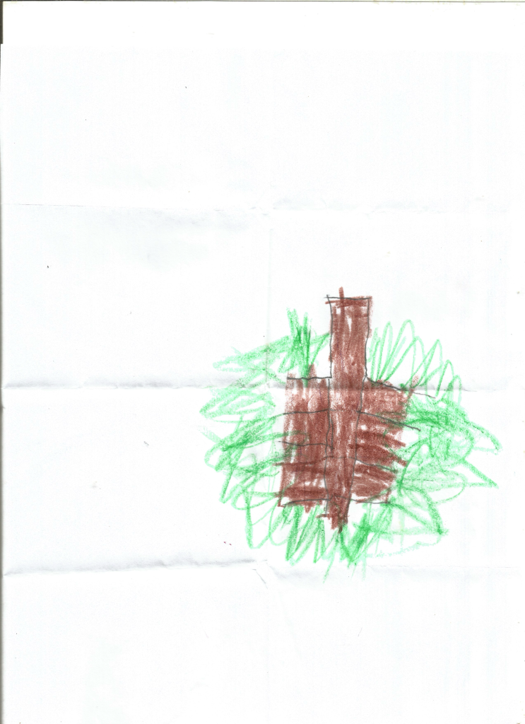 • La dirección del dibujo es vertical. La ilustración muestra un árbol con ramas delgadas trazadas con lápiz, coloreadas en dirección contraria con color café, dando como resultado ramas/tronco ancho y fuerte. Alrededor trazos con color verde, mostrando un árbol frondoso.