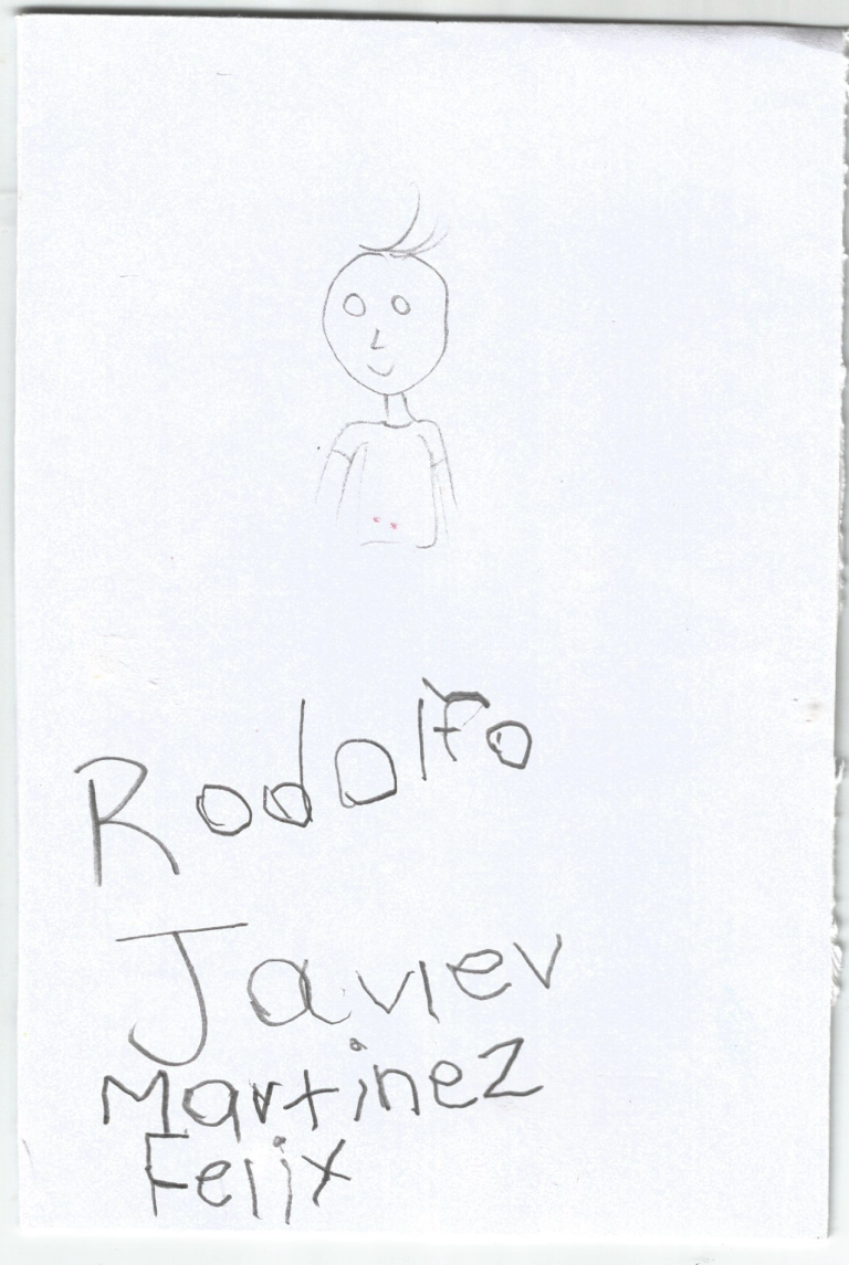 • En la parte superior un breve autorretrato de torso. En la parte de abajo su nombre completo, escrito con ayuda de una de las mamás presentes en el taller: “Rodolfo Javiev Martinez Felix”.