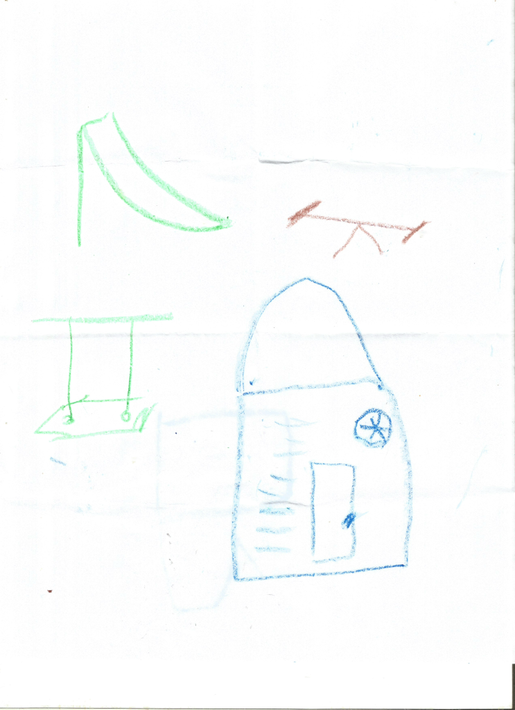 - Francisco ilustro tres juegos. Una resbaladilla verde, un sube y baja color café, después un columpio verde. Como último con una ventana, un techo y una puerta: una casa azul.